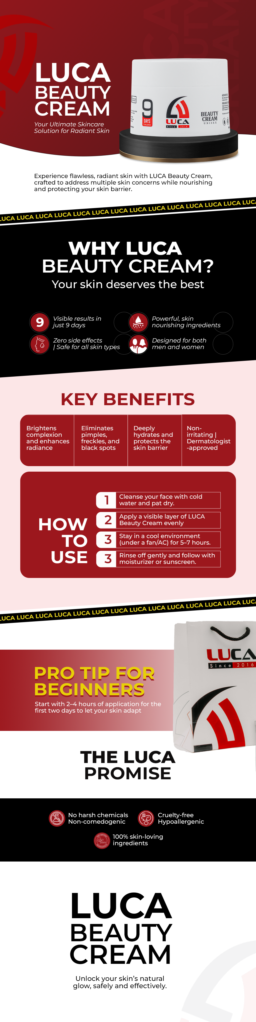 Reveal your natural radiance with LUCA Beauty Cream – the ultimate skin solution for both men and women. See visible results in just 9 days with powerful, skin-loving ingredients that hydrate, brighten, and protect your skin.